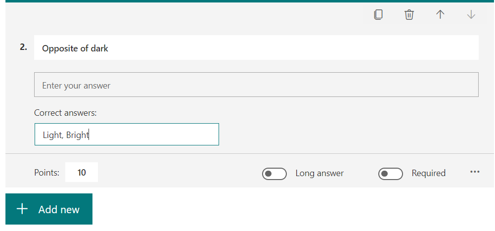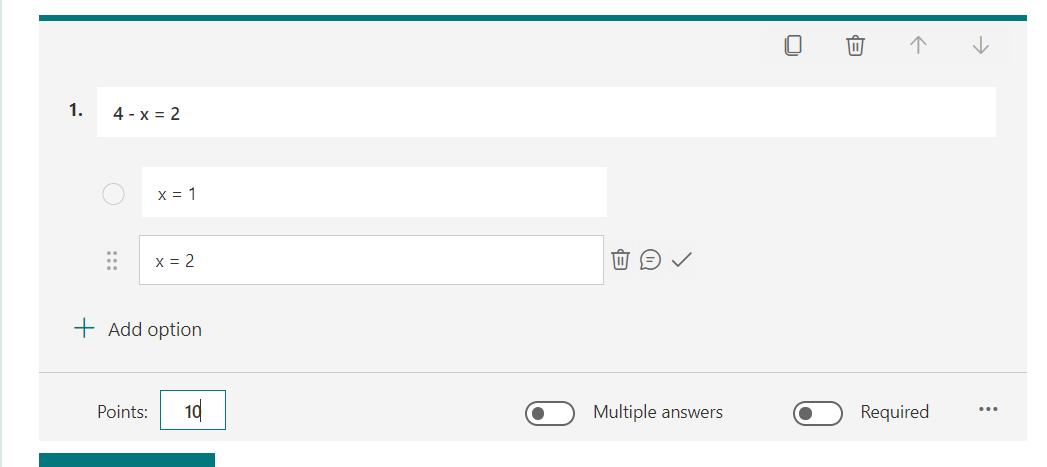 When creating a quiz question, clicking the check mark next to an answer will designate it as correct. The point value for the question is entered in the text box in the bottom left.