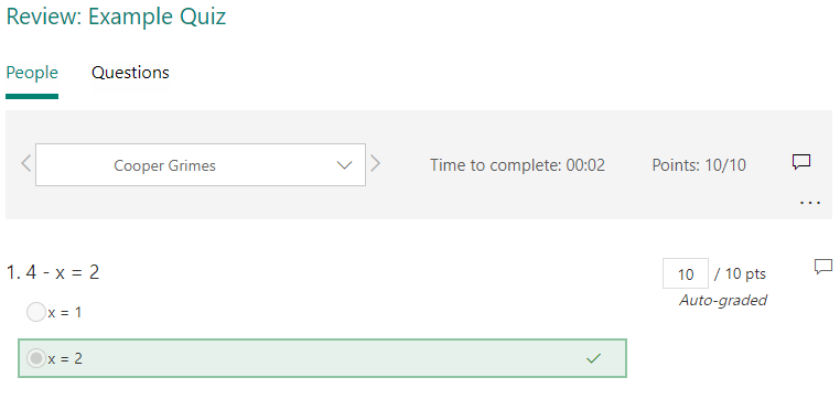 Some types of quiz questions will be automatically scored, such as the Choice question type shown above. Others will need answers to be entered before hand, such as the short Text question type.