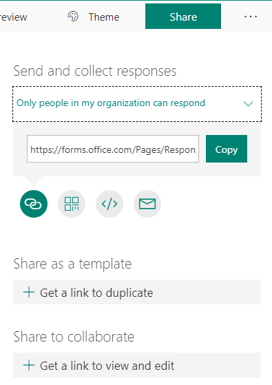 Clicking Share in the top right of the window when viewing your Form will generate a link which can be used by others to take your Form. Note: By default, only one response can be submitted per person and only people from Hendrix will be able to respond.