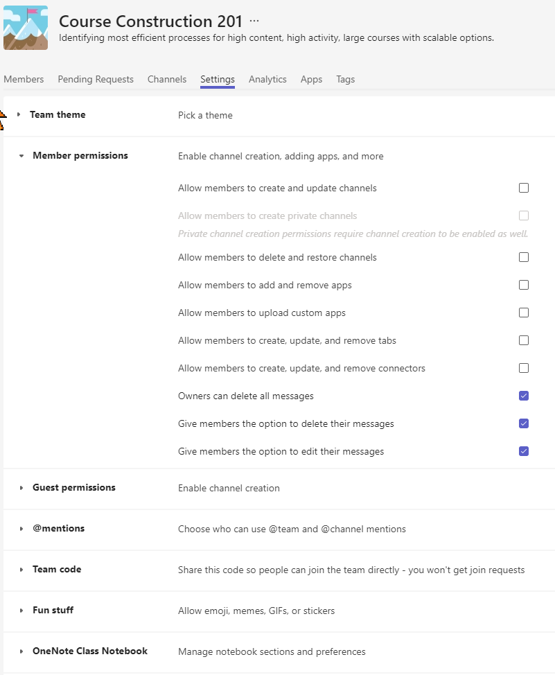 Below are the default settings in Teams with permissions for members to edit and delete their own messages and for other Owners on the Team to delete anyone's messages if needed. For example, for class group activities, consider giving students permissions to create and update channels. Some professors like to have a private channel with each student to have confidential, course-specific dialogue with their students; giving students permission to create private channels saves some of the logistical hesitation when considering doing so for 20 students... (One professor created a zero-point assignment to prompt the students and confirm that they did so.) Explore other sections under Settings for other features to support team needs.