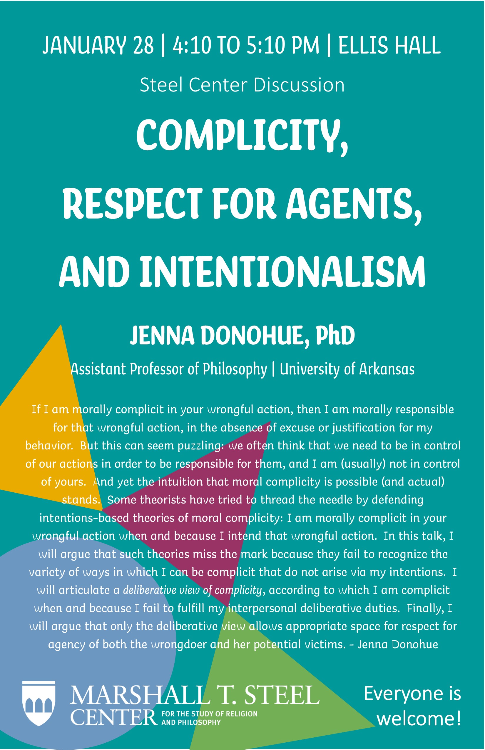If I am morally complicit in your wrongful action, then I am morally responsible for that wrongful action, in the absence of excuse or justification for my behavior. But this can seem puzzling: we often think that we need to be in control of our actions in order to be responsible for them, and I am (usually) not in control of yours. And yet the intuition that moral complicity is possible (and actual) stands. Some theorists have tried to thread the needle by defending intentions-based theories of moral complicity: I am morally complicit in your wrongful action when and because I intend that wrongful action. In this talk, I will argue that such theories miss the mark because they fail to recognize the variety of ways in which I can be complicit that do not arise via my intentions. I will articulate a deliberative view of complicity, according to which I am complicit when and because I fail to fulfill my interpersonal deliberative duties. Finally, I will argue that only the deliberative view allows appropriate space for respect for agency of both the wrongdoer and her potential victims. -Jenna Donohue