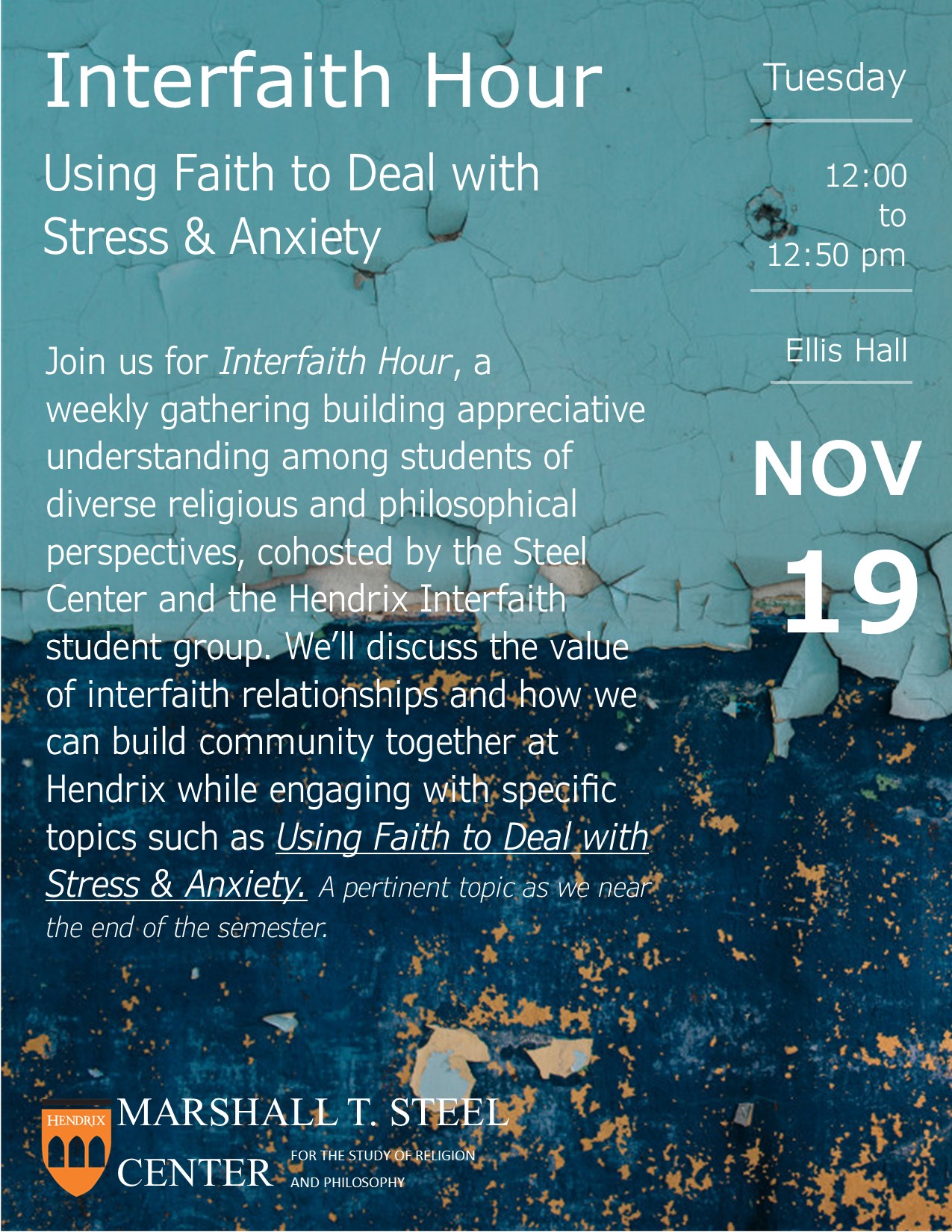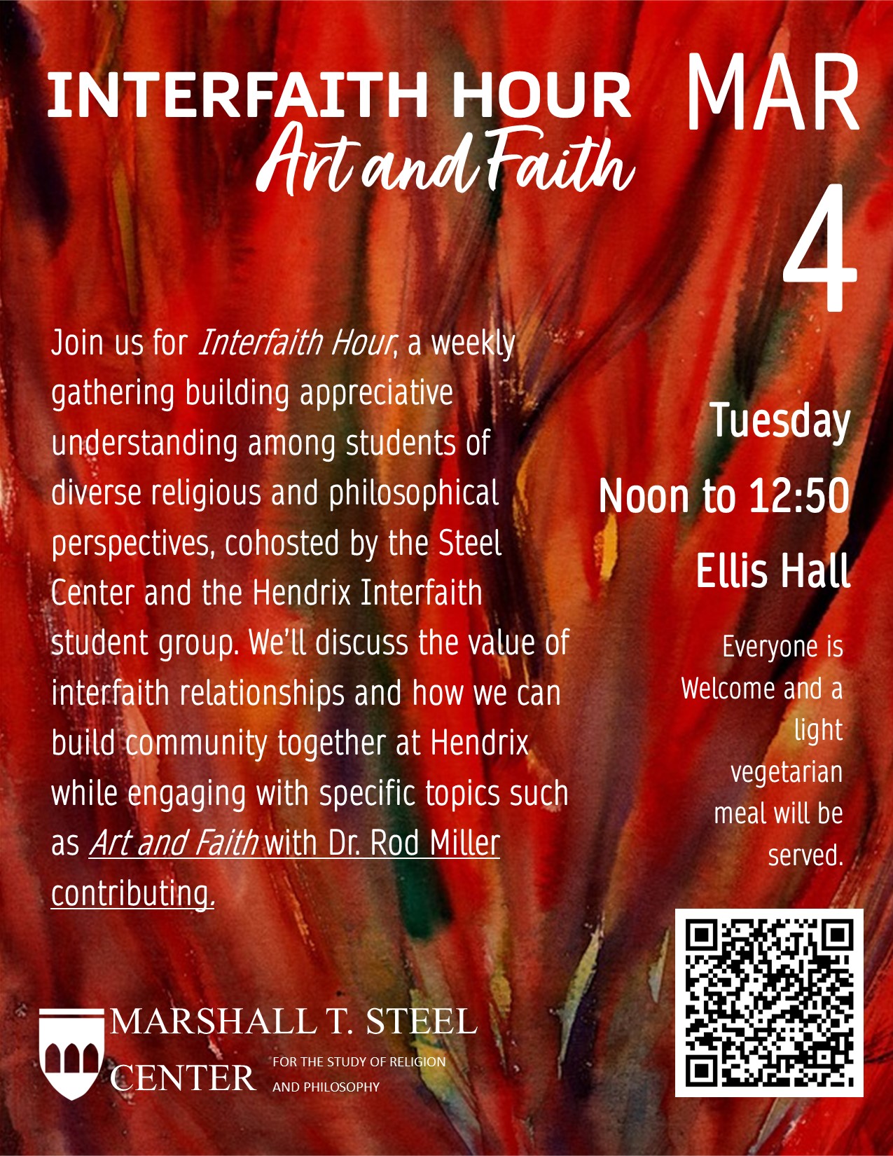 Join us for Interfaith Hour, a weekly gathering building appreciative understanding among students of diverse religious and philosophical perspectives, cohosted by the Steel Center and the Hendrix Interfaith student group. We will discuss the value of interfaith relationships and how we can build community together at Hendrix while engaging with specific topics chosen on a weekly basis.